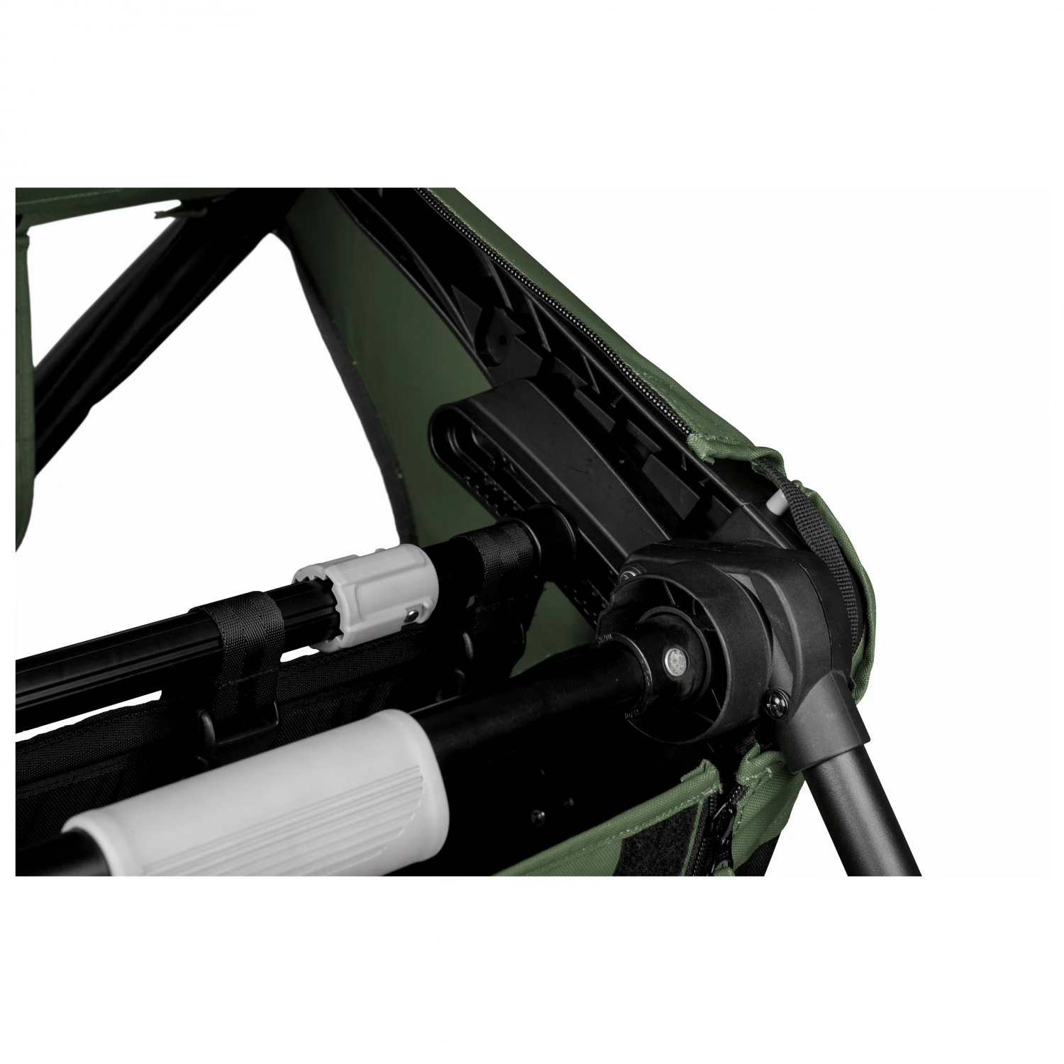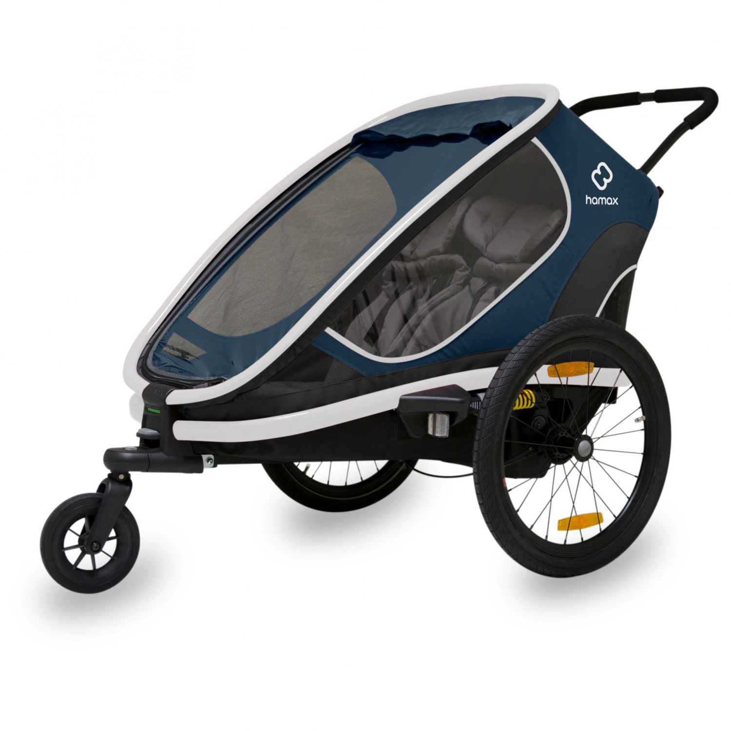 The Outback from Hamax is an excellent bike trailer for everyday use, leisure and trips with the whole family. Whether you use it as a bike trailer behind your bike or as a pushchair, your child will stay safe thanks to the spacious design and the aluminium frame. The bike trailer is equipped with the Safe Connection Point in the front, which lets you safely and quickly change between the bicycle arm, pushchair wheel, jogger wheel and skiing towbar. The buggy equipment and the bicycle arm are included in the delivery.
